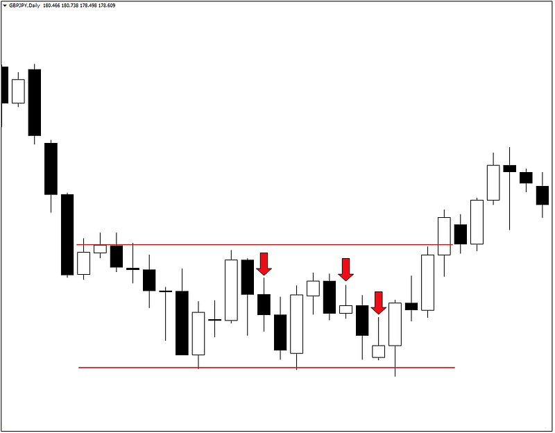 The inside bars in the chart above formed on the GBPJPY daily chart in a choppy market. This sideways price action represents consolidation, which is what you want to avoid when evaluating an inside bar setup.