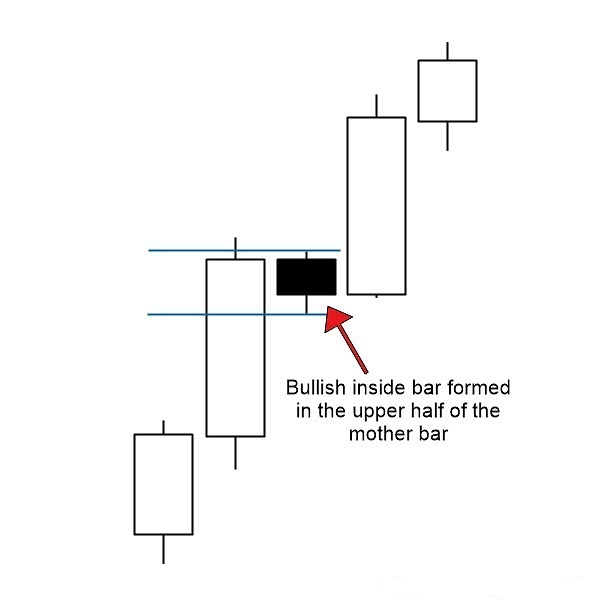 Notice how the bullish inside bar in the above illustration formed at the top of the mother bar’s range. This is what you want to see in a favorable setup, especially if you are using the more aggressive stop loss placement, which means placing your stop loss below the inside bar rather than the mother bar.