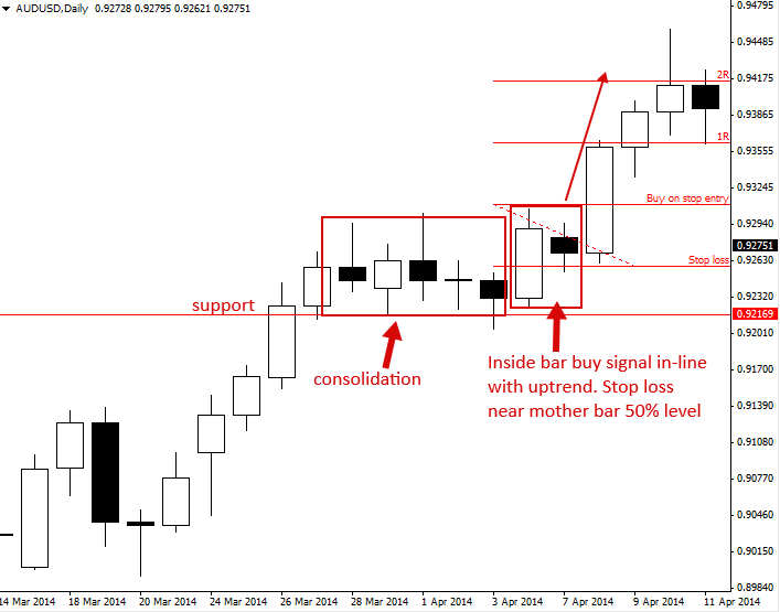 This is the ideal scenario for trading a bullish inside bar setup as the market has gained a fresh set of buyers who are ready to push prices higher. Of course the opposite holds true for trading a bearish inside bar after a break of consolidation.